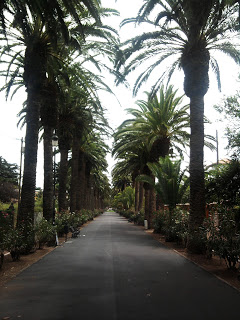 Sigo andando por todo el Camino Largo un encantador paseo con palmera llamadas científicamente Phoenix Canariensis tienen más de 80 años son unas doscientas aproximadamente y gozan de una estupenda salud, están colocadas paralelamente y sumergen al paseante en esa ilusión tropical de sombra, frescor y recogimiento que invita a la reflexión, a la lectura o al amor, porque es también un lugar para el amor sobre todo el amor adolescente, en sus bancos casi todas y todos los laguneros nos hemos dado los primeros besos a lo largo de los tiempos, costumbre que por fortuna no se ha perdido.