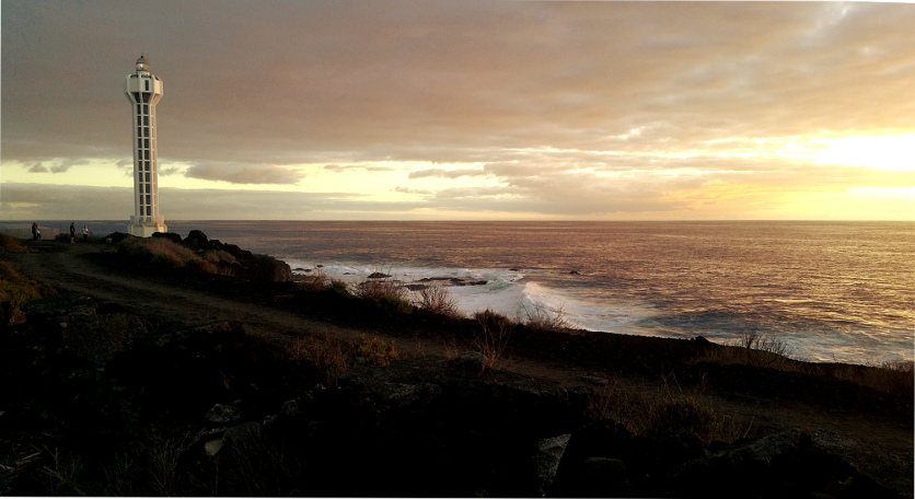 La primera noche acampamos de noche en los aledaños del Faro de Las hoyas, en La Bombilla un asentamiento del Suroeste de la isla, llegamos de noche por lo que alumbrados por los faros de la furgoneta y con algunas dificultades y después de matarnos de risa conseguimos armar la caseta , cenamos y nos tomamos una botella de vino, al despertar por la mañana pudimos disfrutar de una panorámica impresionante, el océano siempre enigmático y una costa escarpada y recortada de riscos, suspendidos en una terraza rocosa que daba al océano por delante, el faro a un costado y detrás y alrededores plantaciones plataneras por todas partes.